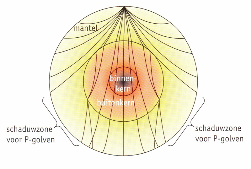 Er zijn verschillende soorten trillingen, waarvan de belangrijkste P-golven en S-golven zijn. P-golven komen het eerst aan bij de detector, daarna S-golven en vervolgens komen als laatste de oppervlaktegolven aan, die ook meteen de grootste uitwijking geven in de grafiek. P- en S-golven gaan dwars door de aarde heen. S-golven kunnen echter niet door een vloeibare stof dus gaan ze niet door de vloeibare buitenkern heen. Hierdoor ontstaat een zogenaamde schaduwzone: een zone waar geen golven ontvangen worden. Ook bij P-golven heb je te maken met schaduwzones, hoewel deze wel een stuk kleiner zijn dan de schaduwzone van de S-golven. De schaduwzones bij de P-golven ontstaan doordat de golven door verschillende soorten en fases gesteente moeten. Hierdoor buigen in de belangrijke overgangen, zoals die van de mantel naar de buitenkern, de golven af en kunnen ze weerkaatst worden. Door deze afbuigingen ontstaan er schaduwzones op de plekken waar geen P-golven komen.